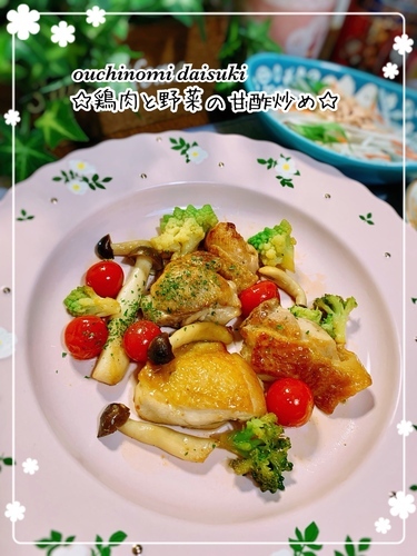 #ミニトマトまた定番中の定番☆(今年から新しい献立を取り入れたいと思いながらも、、)鶏肉と野菜の甘酢炒め鶏肉の皮目からカリっと焼いたらひっくり返···